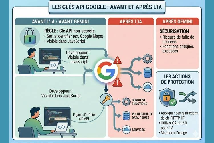 Pendant plus d’une décennie, Google a dit aux développeurs que les clés API (AIza…) n’étaient pas des clés secrètes et qu’elles servaient juste à identifier un projet (comme pour Google Maps ou Firebase), et pouvaient être publiées dans le JavaScript d’un site sans problème. Mais avec l’arrivée de l’API Gemini (l’IA générative de Google), tout a changé.