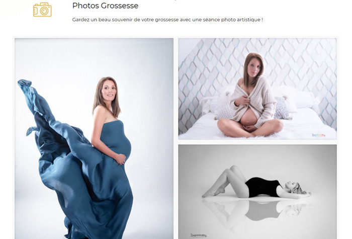Le site propose une section consacrée aux tarifs des différentes formules proposées par la photographe. Un système de filtres permet au visiteur d’afficher facilement le type de séance photographie qui l’intéresse – grossesse, bébé, famille, mariage, etc. – et d’accéder à la fiche détaillée d’un seul clic.